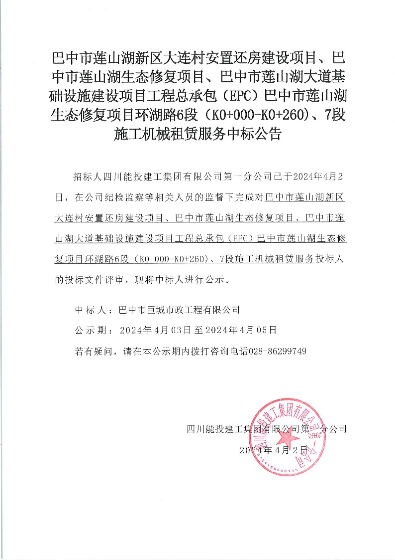 巴中市莲山湖生态修复项目环湖路6段(K0+000-K0+260)、7段施工机械租赁中标公告