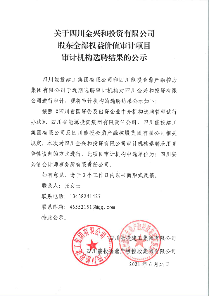 关于四川金兴和投资有限公司股东全部权益价值审计项目审计机构选聘结果的公示
