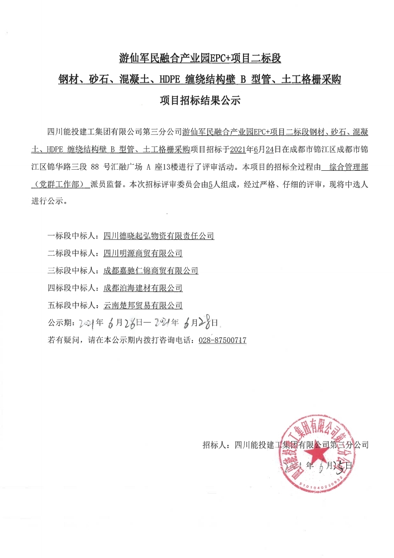 游仙军民融合产业园EPC+项目二标段钢材、砂石、混凝土、HDPE缠绕结构壁B型管、土工格栅采购项目招标结果公示